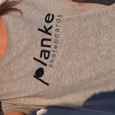 Ladies Grey relaxed basic t-shirt short sleeve 90% cotton / 10% viscose Planke skateboards print Screenprinted in Belgium € 25,00 kleur maat XS S M L